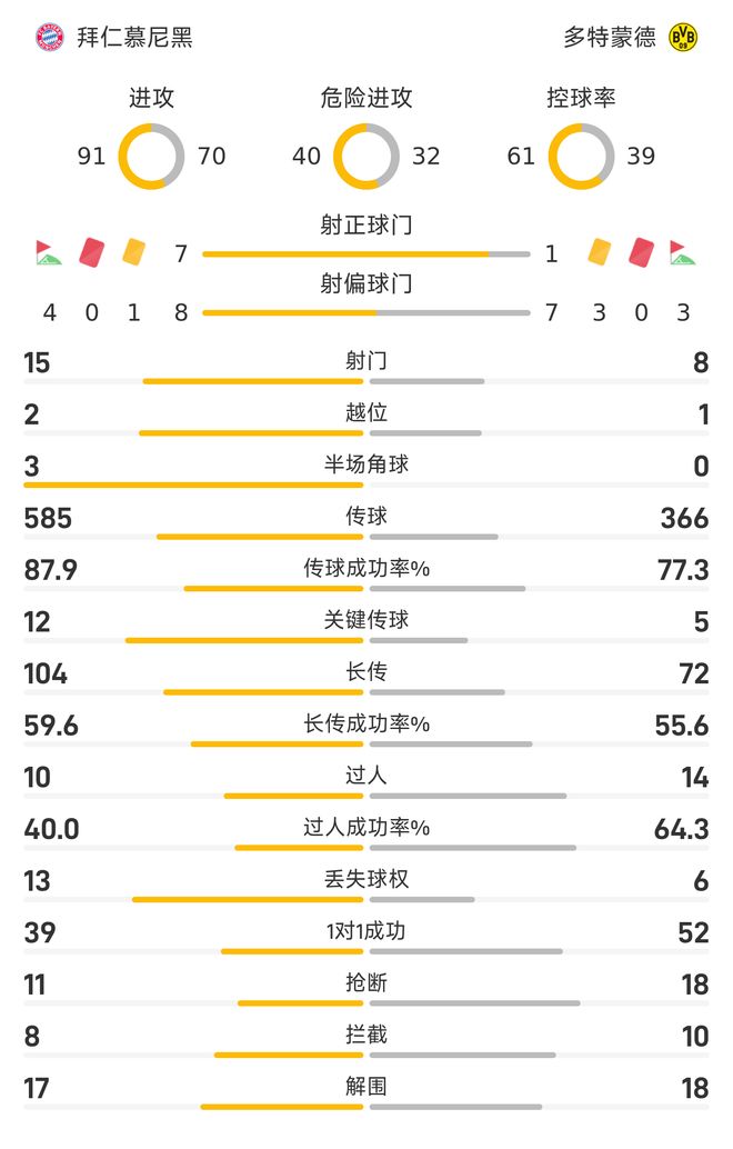在这场比赛里,拜仁在射门方面以15-8明显占优;其中在射正方面,拜仁更是以7-1遥遥领先。在控球率方面,拜仁也以61-39%明显占优。在传球方面,拜仁以585-366远远高出对手;在传球成功率方面,拜仁以87.9%-77.3%同样占优;其中在关键传球方面,拜仁也以12-5明显高出对手。在过人方面,多特以14-10领先;过人成功率方面,多特也以64.3%-40%占据着上风。